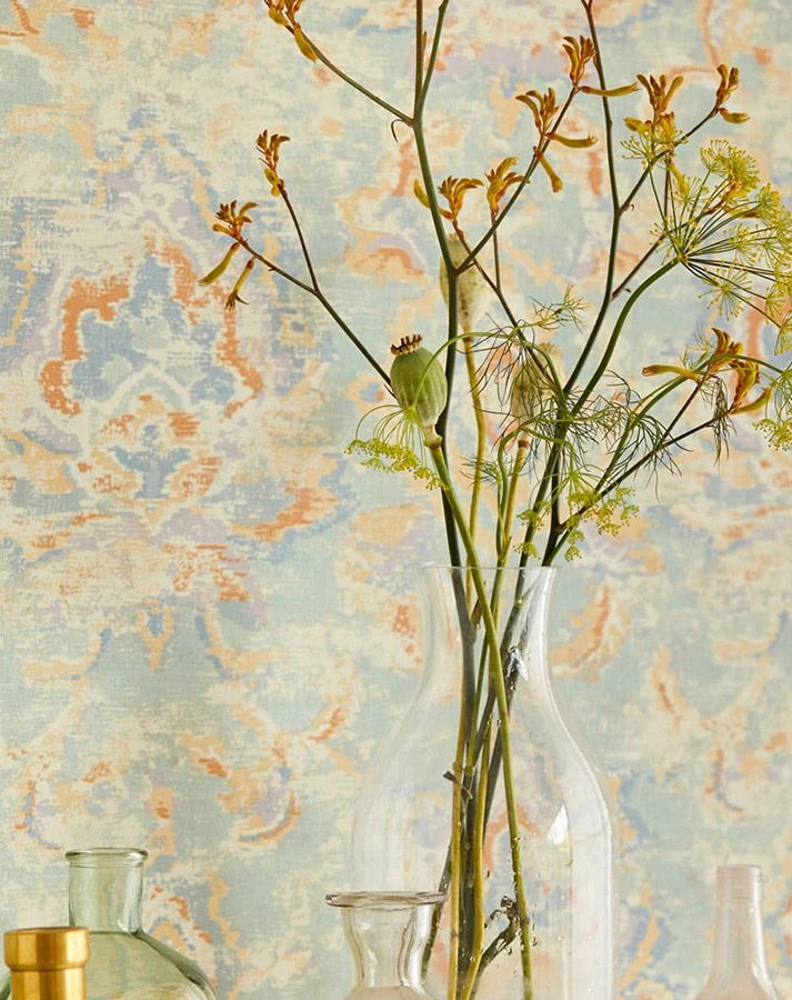 Sie lieben das Surrealistische, das Unfassbare, Kreationen, die zum Nachdenken anregen? Design Tapete Lompal in einer Farbkombination aus Pastellgrün, Azurblau, Beige, Minttürkis, Orange und Pastellviolett eröffnet die Welt der Fantasien. Ethno-Ornamente im indischen Stil mit Batikcharakter laden zum Erspüren ein und das im wahrsten Sinne des Wortes, denn die Vinyloberfläche weist eine textilähnliche Struktur auf.
