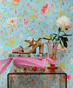 Zwischen der blumigen Vielfalt hängen Tassen an Zweigen, kleine Vögel und Schmetterlinge bewundern die Farbenpracht. Wer würde sich in dieser hellblauen Fantasiewelt nicht wohl fühlen?