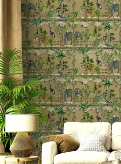 Luxuriös und exotisch verwandelt Lunasa mit ihren detailreichen Abbildungen Ihren Raum in die Suite eines orientalischen Palastes. Auf perlgoldfarbenem Grund sind zwischen Säulen, Balustraden und verschiedenen Palmen und Sträuchern Elefanten, Tiger, Affen und Pfauen zu sehen. Das schimmernde Perlgold lässt die Vliestapete besonders edel wirken und bietet einen tollen Hintergrund für die lebendige Vielfalt der Illustrationen.