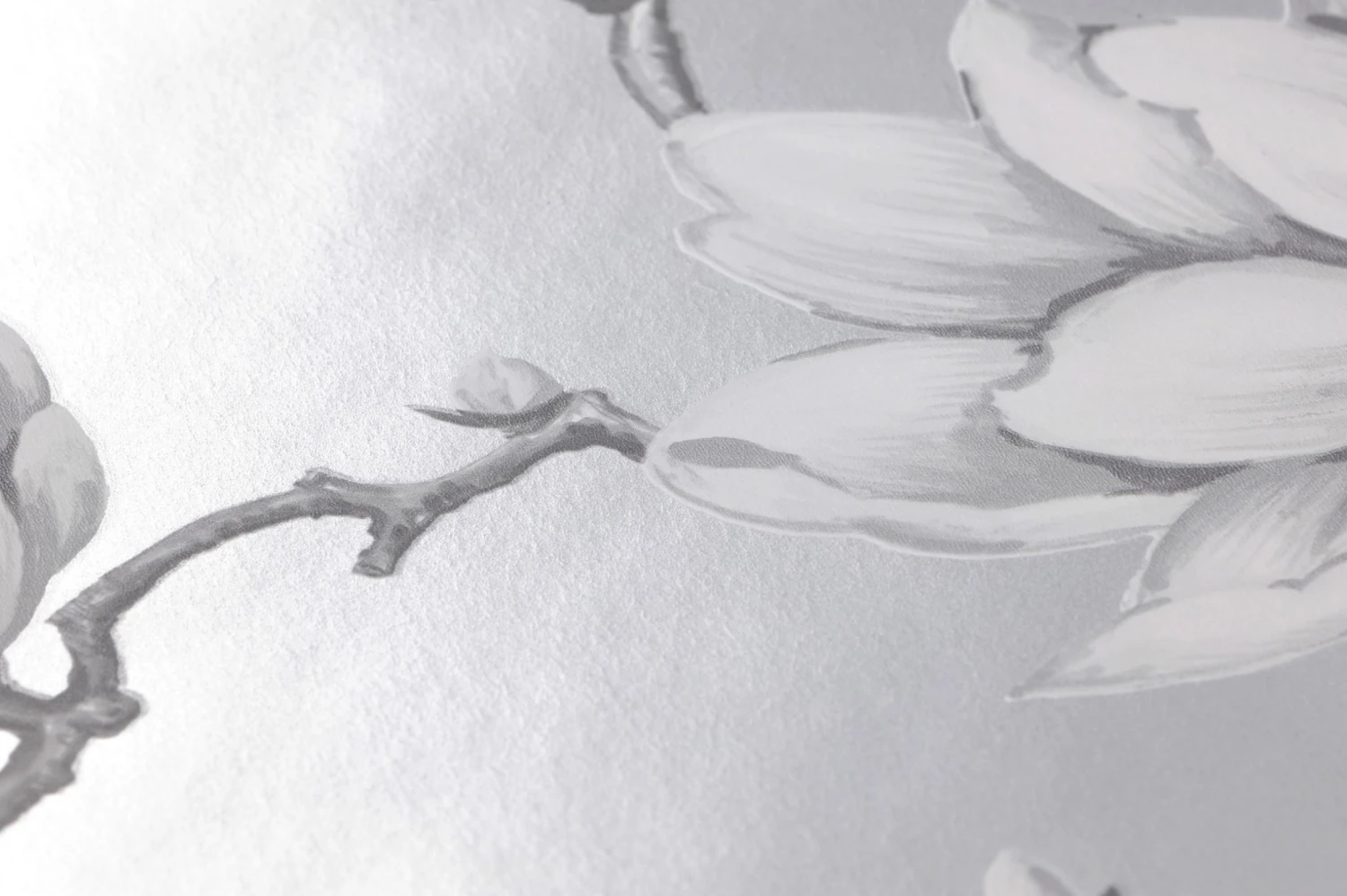 Die kühle Reinheit der schönen Magnolie entspannt die Sinne und erinnert an das Märchen der Schneekönigin. Die Blüten in Dunkelgrau, Hellgrau, Weiss betonen die anmutige Ausstrahlung der prächtigen Pflanze. Schimmerndes Perlhellgrau sorgt für den magischen Glanz, den auch glitzernder Schnee in der Sonne zeigt.