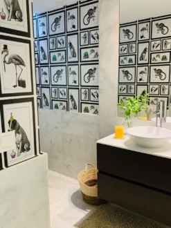 Wie ein Sammelsurium von schwarz gerahmten Kupferstichen bebildert „Maleme“ Ihre Wand mit Abbildungen von Tieren mit ungewöhnlichen Accessoires. Von einem Flamingo mit Aktenkoffer und Melone über eine Giraffe mit Tabakpfeife bis zu einem boxenden Känguru sind witzige Kuriositäten zu entdecken. Details in leicht schimmernden Farben unterbrechen die schwarzweiße Anmutung der extravaganten Papiertapete und ziehen den Blick auf sich.