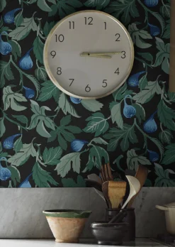 Reife Feigen inmitten kräftiger Feigenblätter entführen Sie in die Region um das Mittelmeer. Geheimnisvoll dunkel ist der Untergrund der Vliestapete, während die Feigen in leuchtendem Blau und Pastellblau zwischen den Grüntönen der Blätter hervorlugen. Je nachdem, wie Sie Ihre Einrichtung wählen, betonen Sie den mediterranen Charakter des Designs oder verleihen dem Landhaus-Stil einen aktuellen, außergewöhnlichen Touch.