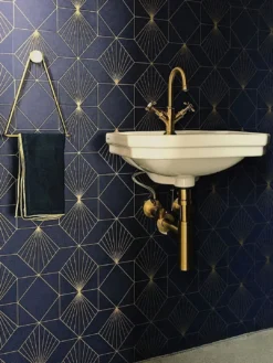 Auf dem tiefem Nachtblau des Untergrunds entstehen aus feinen goldfarbenen Linien klare geometrische Muster: Quadrate, Dreiecke, Trapeze – und immer wieder von einem Punkt ausgehende Strahlen. In der geradlinigen Ästhetik des Art Deco und mit dem stimmungsvollen Zusammenspiel von mattem Blau und schimmerndem Gold ist die Vliestapete ein Genuss für die Augen und eine Kostbarkeit für Ihren Raum.