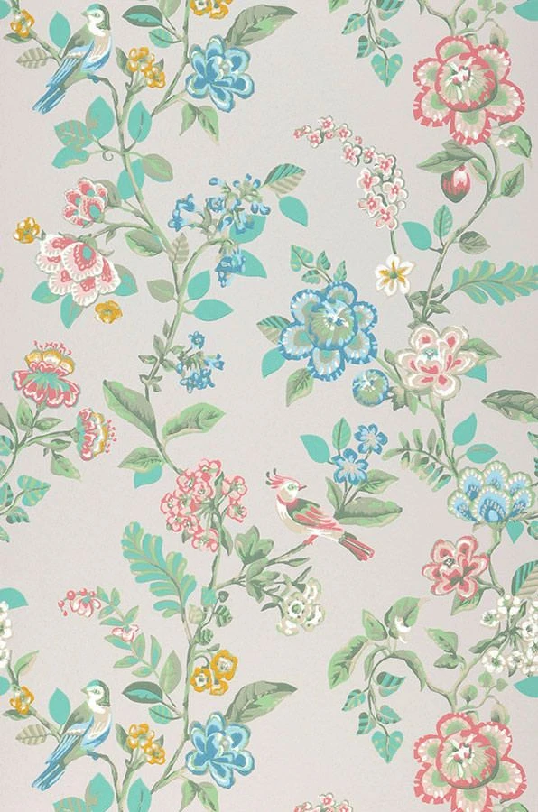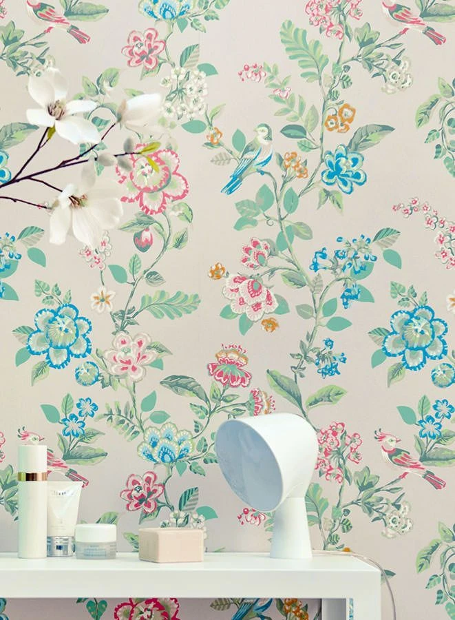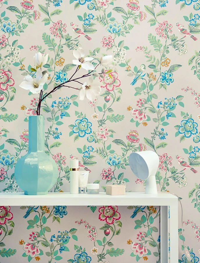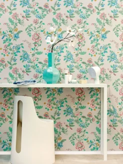 Blumentapete Miri besticht in ihrer hellen Variante durch einen starken Musterfarbmix aus Beige, Dunkelblau, Pastellgrün, Rot, Türkisblau. Romantik mit dem Plus an Koketterie und intensivem Wirkungsspektrum sind genau die richtigen Zutaten für Räume, die beeindrucken.