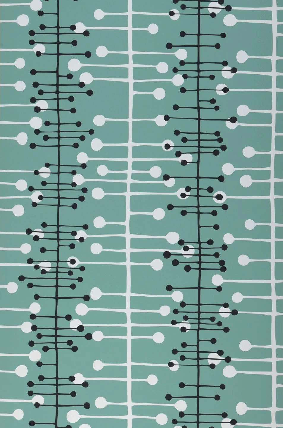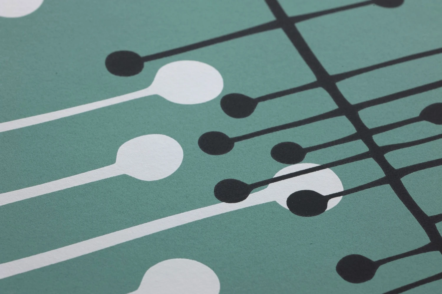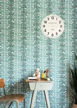 Vliestapete Muscat präsentiert ein ausgefallenes Vintage-Design aus grafischen Elementen. Wie handgezeichnet wirken die Linien, Querstriche und Kreise, aus denen sich ein Muster wie ein raffinierter Perlenvorhang zusammensetzt. Das Muster in Schwarz und Weiß auf einem minttürkisfarbenen Grund gibt einer schicken Küche, einer Bar im Retro-Look oder auch einem Büro einen reizvollen nostalgischen Charme und ist ebenfalls eine spannungsvolle Ergänzung zum skandinavischen Einrichtungsstil.