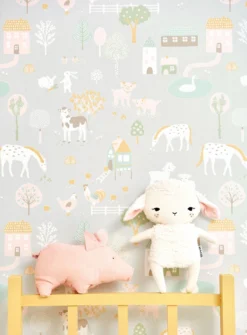 Wie auf einem richtigen Bauernhof gibt es auf dieser Kindertapete aus dem Hause Majvillan viel zu entdecken: Kühe und Pferde, Schweine, Kaninchen und Hühner, Lämmer und sogar Schwäne tummeln sich liebevoll gezeichnet zwischen den Hofgebäuden und den blühenden Bäumen. Das kindgerechte Design und die zarten Farben auf weißgrauem Untergrund sorgen für eine helle, freundliche Stimmung im Kinderzimmer.