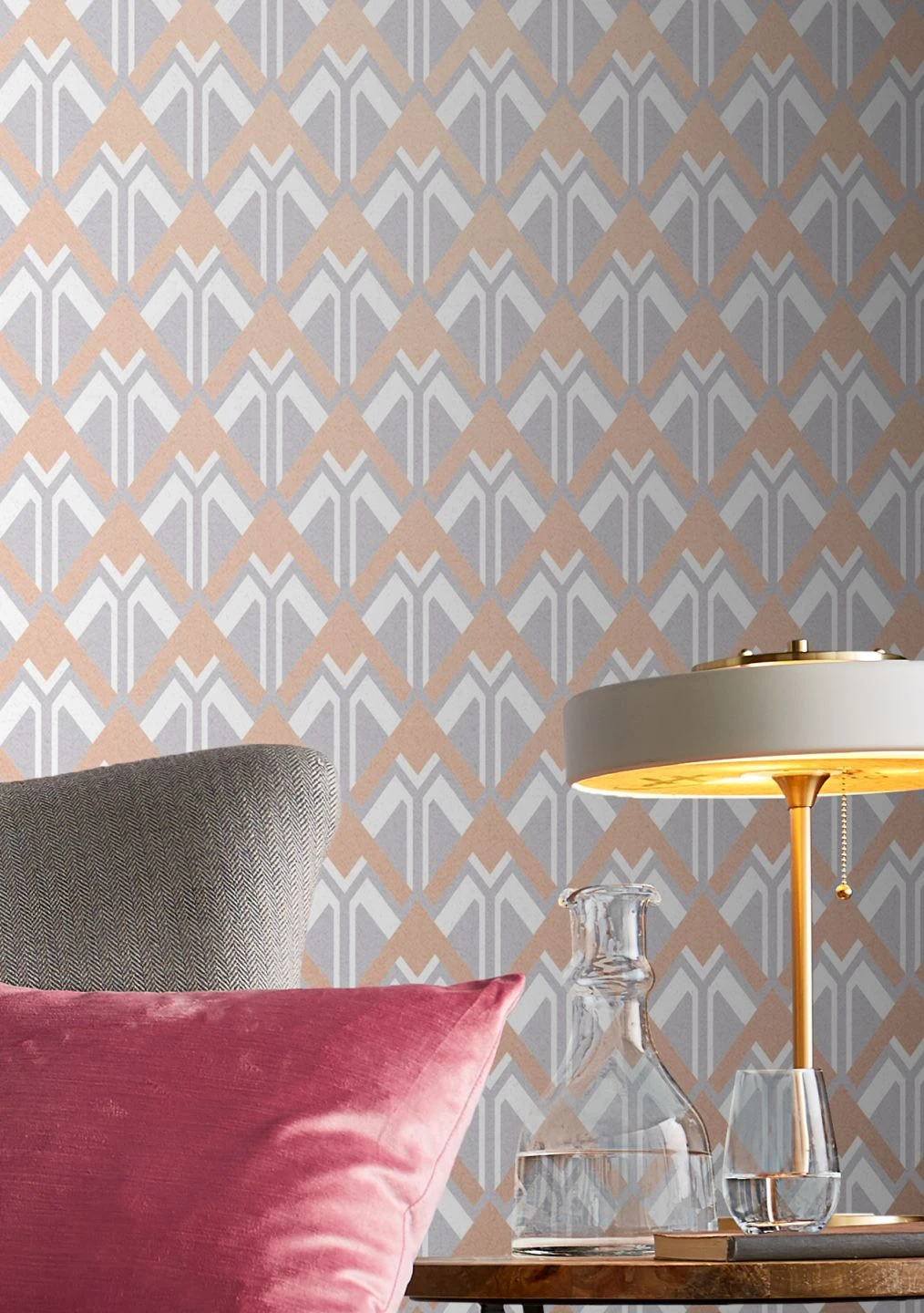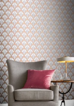 Kunstvolle Geometrie ohne Anspruch auf eine konkrete Zuordnung zeichnet diese grafische Tapete aus. Während die Elemente in Grau und Weiß dem aufstrebenden Gedanken folgen, vermittelt Rosenholz Schimmer die Vision von plastischer Tiefe. Das moderne Art Deco Muster harmoniert wunderbar mit authentischen Vintage Looks.