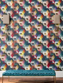Die Illusion dreidimensionaler Formen entsteht im ausgeklügelten Design dieser Tapete. Aus Linien und Streifen kräftiger, bunter Farben setzen sich Dreiecke und Trapeze zusammen. Die geschickte Anordnung der farbigen Streifen und der Oberflächenstruktur schafft den Eindruck von Tiefe. Die farbenfrohe Vliestapete macht Ihre Wand zu einem interessanten Einrichtungselement und lässt sich mit dem ganzen Spektrum der verwendeten Farbtöne ideal kombinieren.