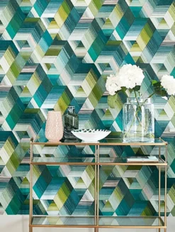 Blau- und Grüntöne, dazwischen ein wenig helles Minttürkis und Rosa, reichen aus, um an Ihrer Wand eine optische Illusion zu erzeugen. Die farbigen Linien und Streifen und die Oberflächenstruktur dieser Vliestapete sind so raffiniert angeordnet, dass sie den Eindruck von vierkantigen Hohlräumen erzeugen und die Fläche Ihrer Wand auflösen. Der faszinierende Effekt erinnert an die Zeichnungen von M. C. Escher.