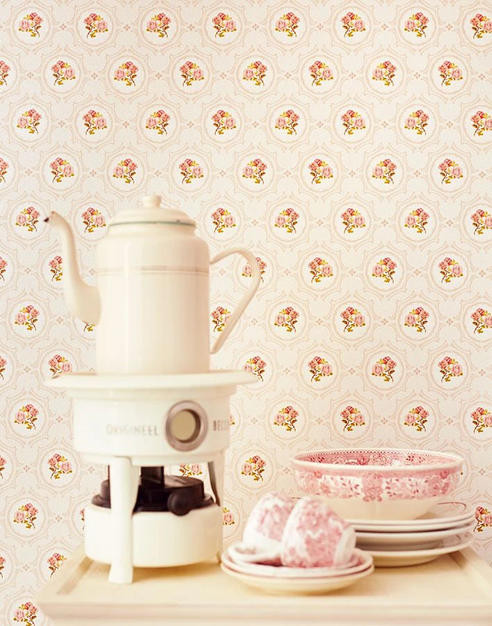 Verspielte Rosenromantik in einer rosaroten Gesamterscheinung – Landhaus Tapete Nissi vereint liebevolle Nostalgie mit traditionellen Stilmotiven der Romantik. Sie vermittelt Geborgenheit und Stille, die nur durch Vogelzwitschern sanft unterbrochen wird. Der verliebte Zauber, den die rosige Design Tapete verströmt, macht sich in jedem Raum wunderbar bemerkbar.