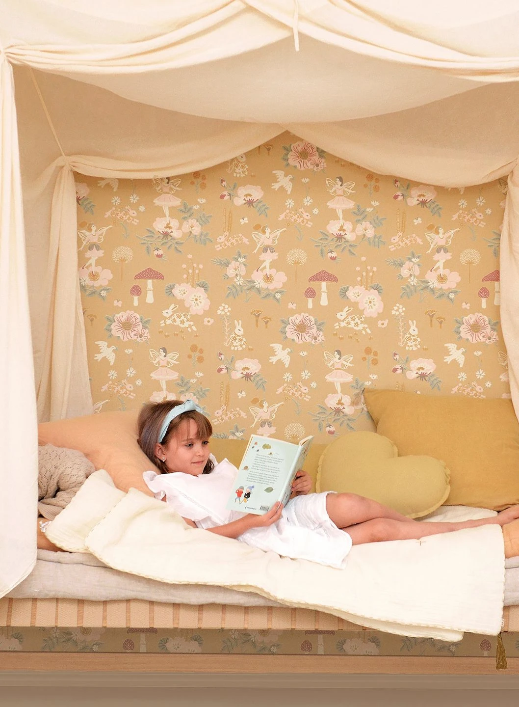 In ein wahres Märchenland verwandelt die Tapete „Old Garden“ des schwedischen Herstellers Majvillan das Kinderzimmer. Zwischen Blumen und Pilzen sind Feen, Hasen, Tauben und Schmetterlinge zu entdecken. Der Zauber, der von den kindgerechten Illustrationen ausgeht, gewinnt noch an Ausstrahlung durch das verwendete Leimdruckverfahren. Die Farben Hellrosa, Minttürkis, Ocker, Weinrot und Weiß schaffen mit dem beigefarbenen Untergrund ein harmonisches Gesamtbild.