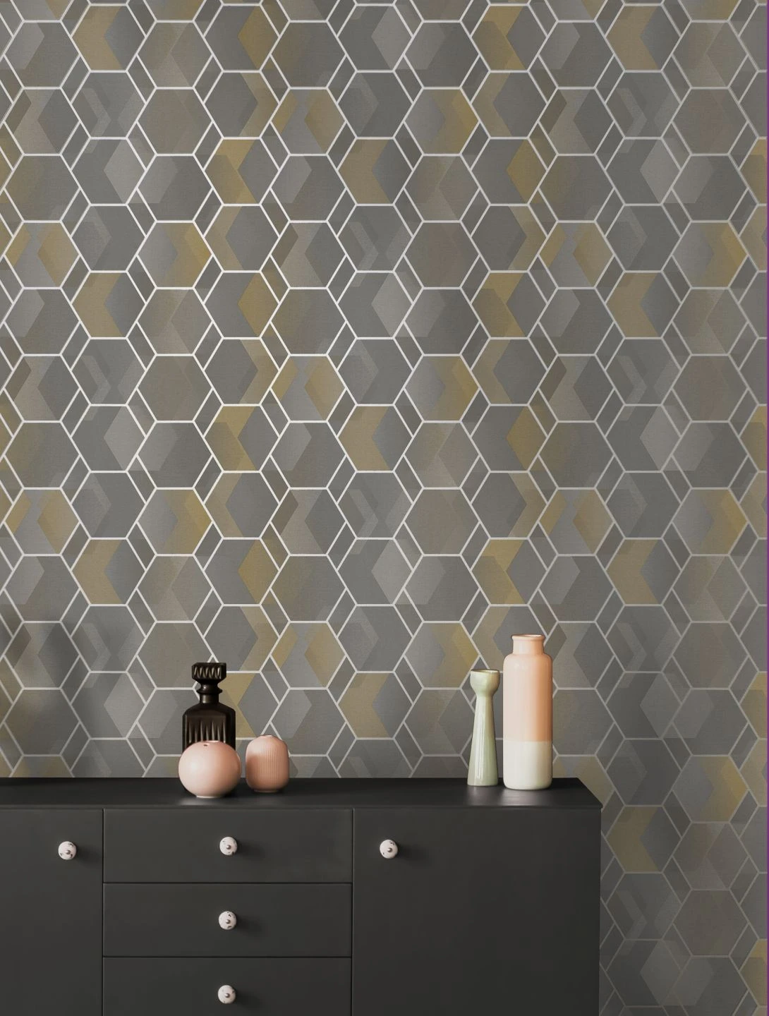 Wie einzelne Sonnenstrahlen, die beginnen, den Morgennebel aufzulösen, spielt die Vliestapete Opalino mit der spannungsvollen Kombination aus sanften, hellen Grautönen und hellgelben Farbverläufen. Das Muster von Hexagonen und Rauten, das aus den Abstufungen der Helligkeit entsteht, scheint dreidimensional und wird durch leicht schimmernde Linien in Perlbeige akzentuiert. Ein schönes Detail ist die dezente Optik geflochtener Bastmatten, die der glatte Grund der Tapete aufweist.