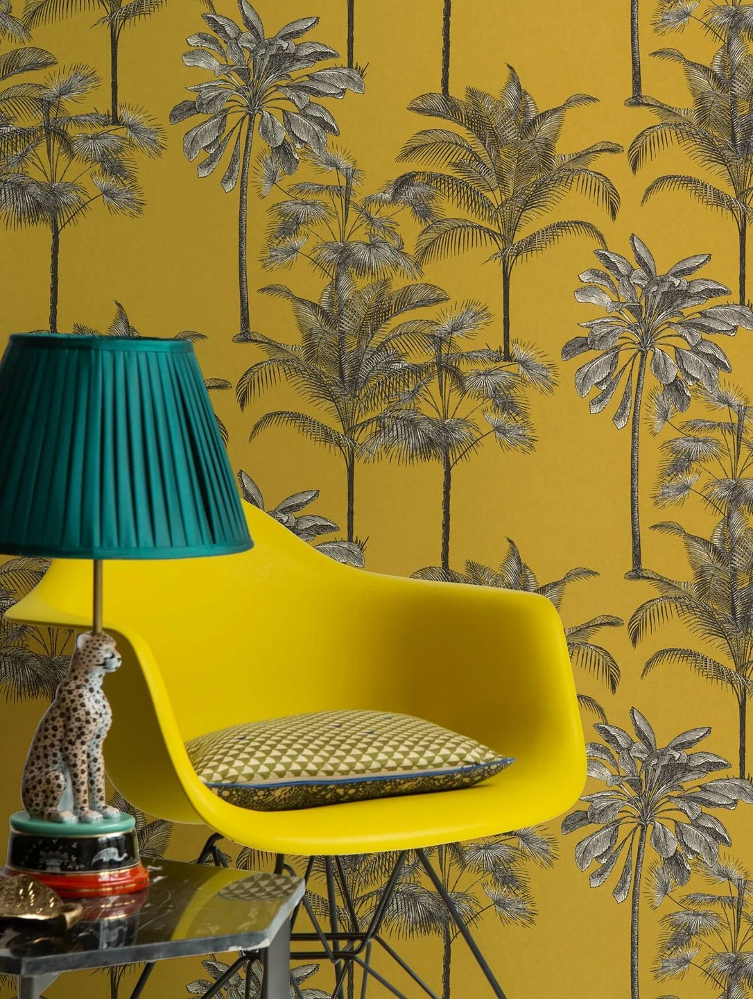 Auf dem sonnig honiggelben Grund der Vliestapete sind die eleganten Palmen mit ihren fein verästelten Blättern ganz in Schwarzweiß gehalten. So kommt die filigrane Struktur der sich überlappenden Palmwedel besonders beeindruckend zur Geltung. Die außergewöhnliche Vliestapete erfüllt Ihre Wohnung mit der Sonne der Tropen und erinnert Sie auch im kältesten Winter daran, dass Sonnenschein und Wärme zurückkehren werden.