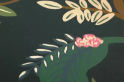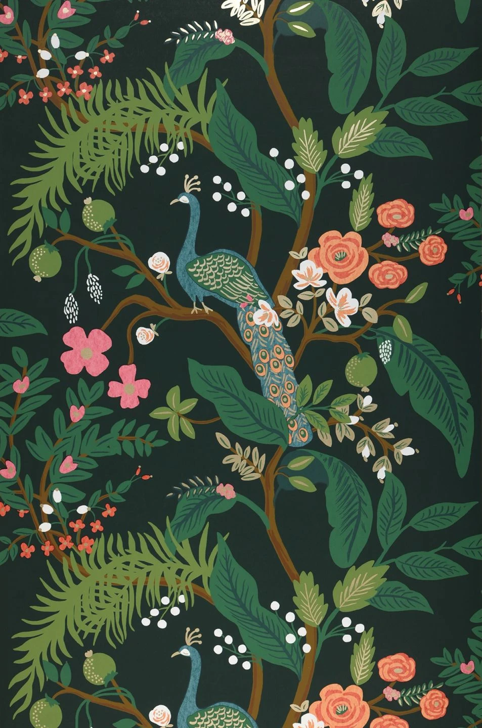 Zwischen den Blumen, Blättern und Pflanzen im typischen Design von Rifle Paper fallen liebevoll gemalte Pfauen mit blau und grün schimmerndem Gefieder und prachtvollen, detailliert dargestellten Schwanzfedern auf. Auf der dunkelgrünen Grundfarbe zeigen die Grün- und Blautöne, das Perlbeige und die Schattierungen von Rosa strahlende Leuchtkraft. In Verbindung mit Weiß oder einer der Musterfarben zaubert die Vliestapete buntes Leben an Ihre Wände.