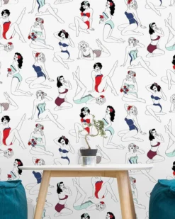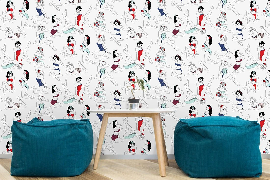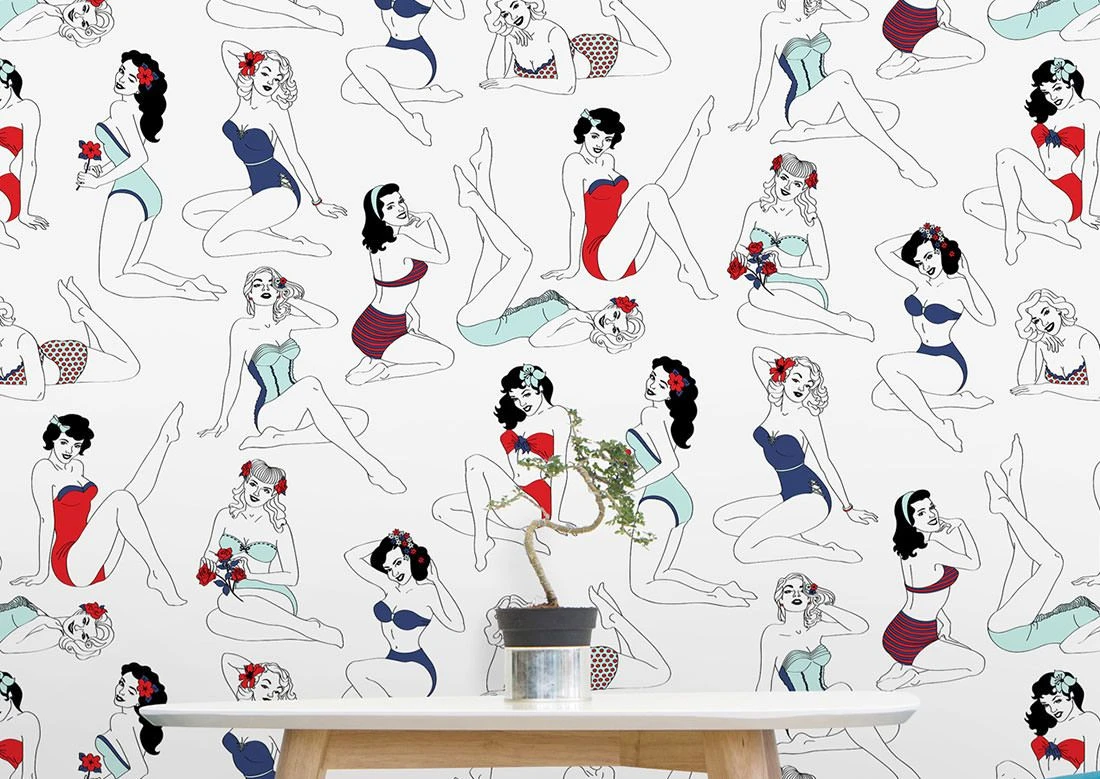 Man nehme einen herrlichen Sommertag in Florida Beach sowie sexy Pin-up Girls mit scharfen Kurven und ordne sie in reizvollen Posen und mit Understatement-Farben zu einem tanzenden Muster an – Fertig ist das Dupenny-Meisterstück für Wohndesign mit nostalgisch stimmungsvoller Strandatmosphäre, die rassige Schönheit ausstrahlt.
