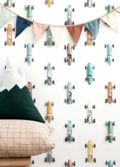 Da fahren sie auf der Wand entlang, die flotten Flitzer aus den Anfängen des Rennsports. Die nostalgischen Rennwagen wirken in der Tat wie aufgesetzte Spielzeugautos, die nur noch auf den Startschuss warten. Es könnte auch eine wertvolle Sammlung sein, die durch den weißen Hintergrund perfekt zur Geltung kommt. Die Mustertapete von Studio Ditte bietet Raum für zahlreiche Interpretationen und Aktionen.