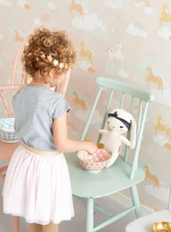 Bunte Einhörner auf Wolken, dazwischen Sterne und Regenbögen – die Vliestapete „Rainbow treasures“ vom schwedischen Hersteller Majvillan beschwört ein kindliches Abenteuerland herauf. Die Motive in Altrosa, Cremeweiß, Honiggelb, Pastellorange und Weißgrün und der zartrosa Hintergrund wirken freundlich und anregend. Die hochwertige, im Leimdruckverfahren bedruckte Tapete begleitet Ihr Kind behutsam auf seiner Entdeckungsreise in die Welt.