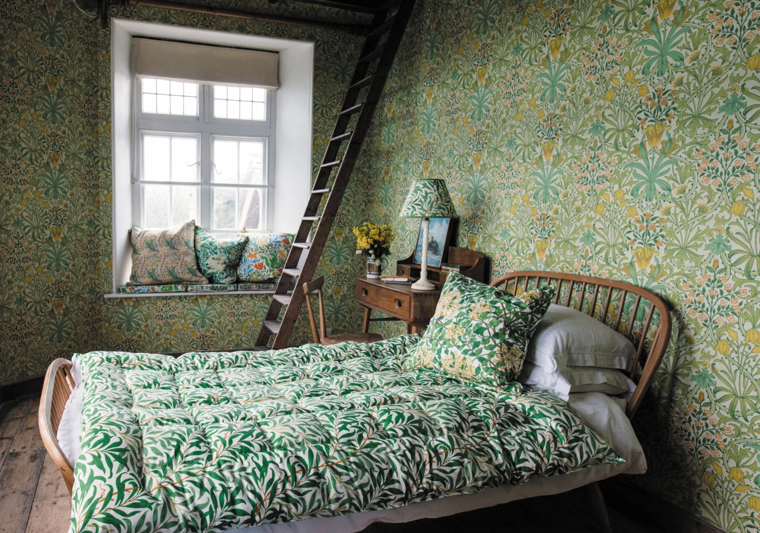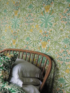 Voller leuchtender Gelb- und Grüntöne auf dem zart gemusterten Grund bringt Rebecca frühlingshaftes Sonnenlicht an Ihre Wände. Das historische Muster von Morris & Co., das dem britischen Designer John Henry Dearle zugeschrieben wird, vereint die stilisierten Blüten und Blattranken des Jugendstils mit den frisch leuchtenden Farben des Frühlings. Im Mittelpunkt stehen kräftig gelbe Tulpen, deren Blätter sich wie ein Feuerwerk vom Stängel her ausbreiten.