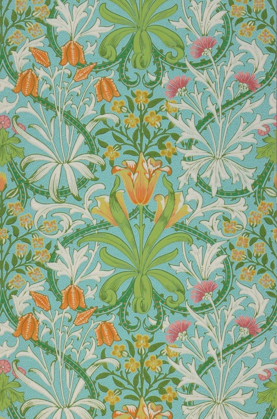 Tulpen, Glockenblumen und viele Blüten mehr in lebhaften Rosa- und Orangetönen, ausladend geschwungene Dornenranken und filigrane Blätter hat der britische Designer John Henry Dearle in seinem Tapetenmuster vom Anfang des 20. Jahrhunderts vereint. Die im Leimdruckverfahren gefertigte Papiertapete aus dem Hause Morris & Co. mit den frühlingshaften Farben auf leuchtend pastelltürkisfarbenem Grund bietet einen perfekten Hintergrund für antike Möbel.
