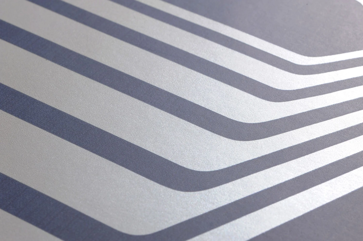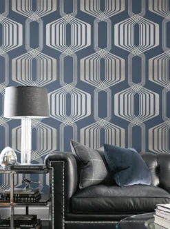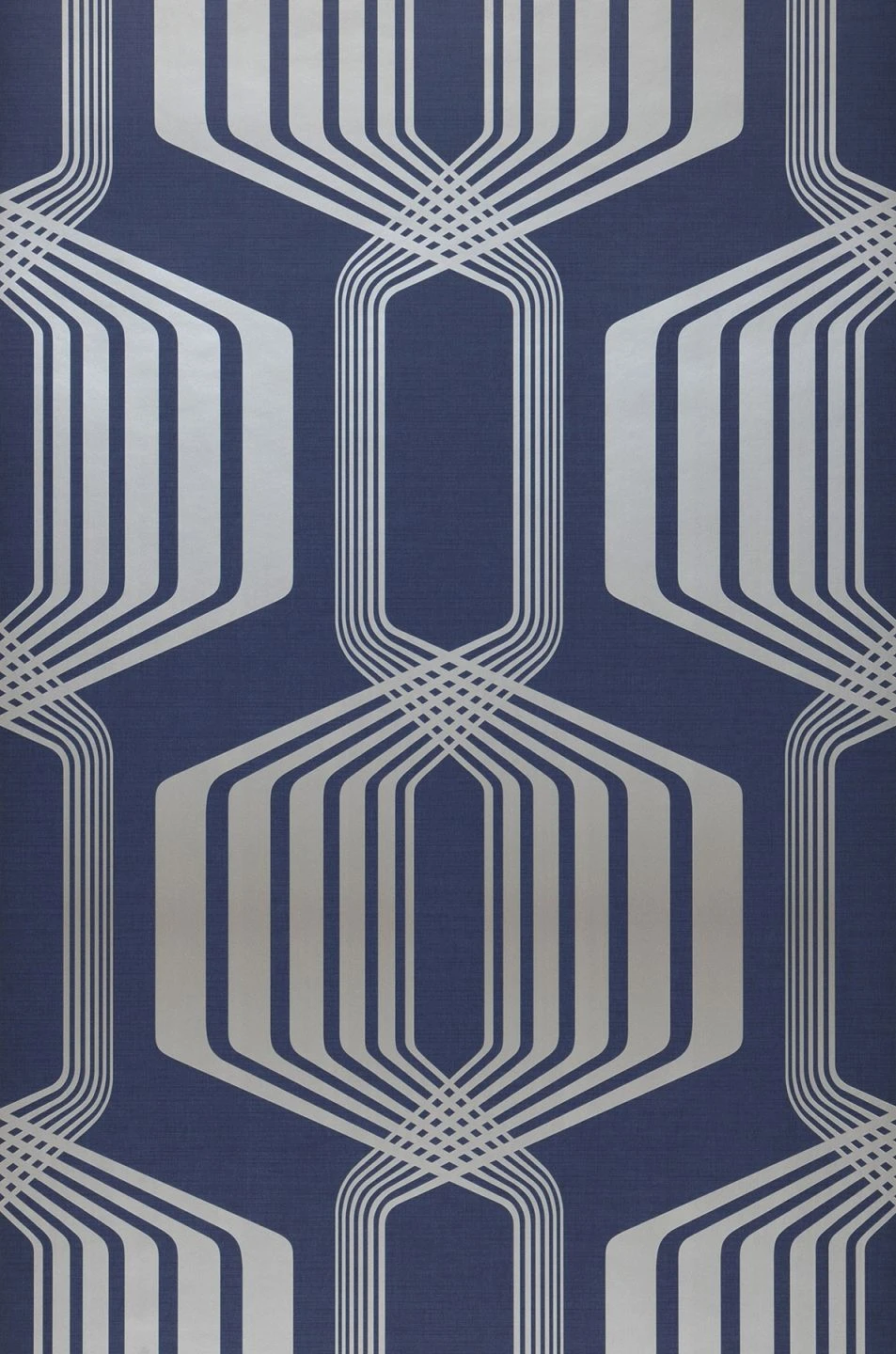 Abstrakte graphische Elemente verbinden sich miteinander, driften auseinander und wieder zusammen und erwecken echtes 70er-Jahre-Feeling. Besonders edel wirkt die Tapete in der hier gezeigten Kombination aus dunkelblauem Untergrund und schimmerndem Perlhellblau als Musterfarbe. Sie erhalten sie auch in elegantem Weißgrau und in den Retro-Farbtönen Graubraun mit Perlbeige und Rosenholz.