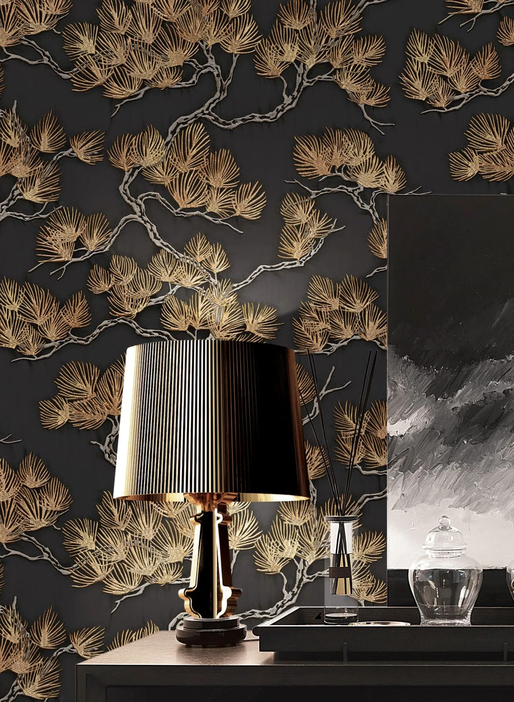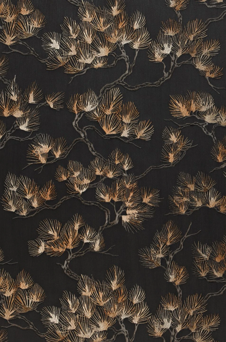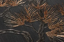 Eine Tapete wie eine handgearbeitete Stickerei: In die Vinyloberfläche ist das Motiv wie feine, fühlbare Stickstiche eingeprägt. Knorrige Pinienzweige mit langen, schlanken Nadeln in Perlbeige und leicht schimmerndem Ockerbraun scheinen auf dem anthrazitfarbenen Grund wie von selbst zu leuchten. Die hübsche Tapete ist eine Hommage an die japanische Kunst. Mit asiatischen Elementen in Ihrer Einrichtung betonen Sie die Anklänge an die Kultur des Fernen Ostens.