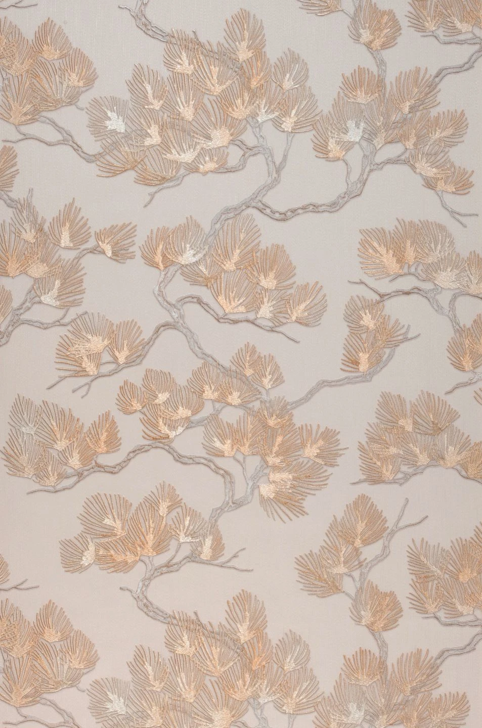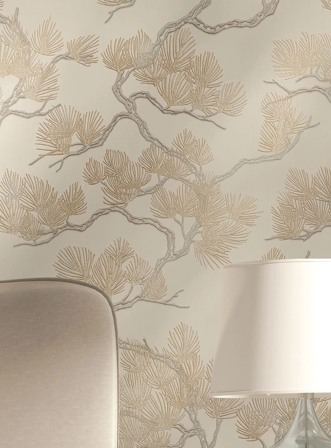 Pinienzweige mit ihren feinen, schlanken Nadeln vereinen die beschützende Atmosphäre eines Waldes mit luftiger, lichtdurchfluteter Offenheit. Die leicht schimmernden Beige- und Weißsilbertöne auf dem cremeweißen Grund wirken freundlich und elegant zugleich. Die feine, fühlbare Struktur des Musters ist in das Vinyl der Tapetenoberfläche eingeprägt und erinnert an eine kostbare Stickerei im fernöstlichen Stil.