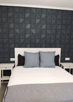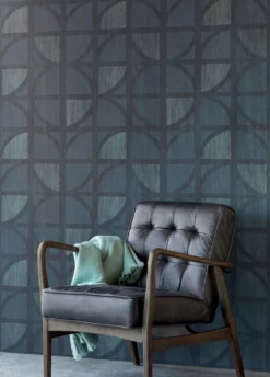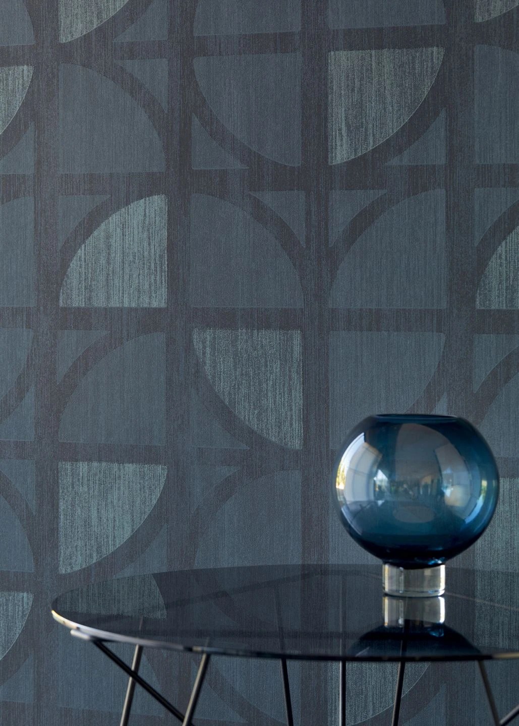 Wie eine mythische Fensterwand nach Art des Jugendstils mutet Designtapete Salima in dunklen Blau- und Grautönen an. Das großformatige Muster eignet sich zur Gestaltung von Akzentwänden ebenso wie zur dekorativen Verkleidung von Trennwänden und Paravents, auch in öffentlichen und gewerblichen Räumen.