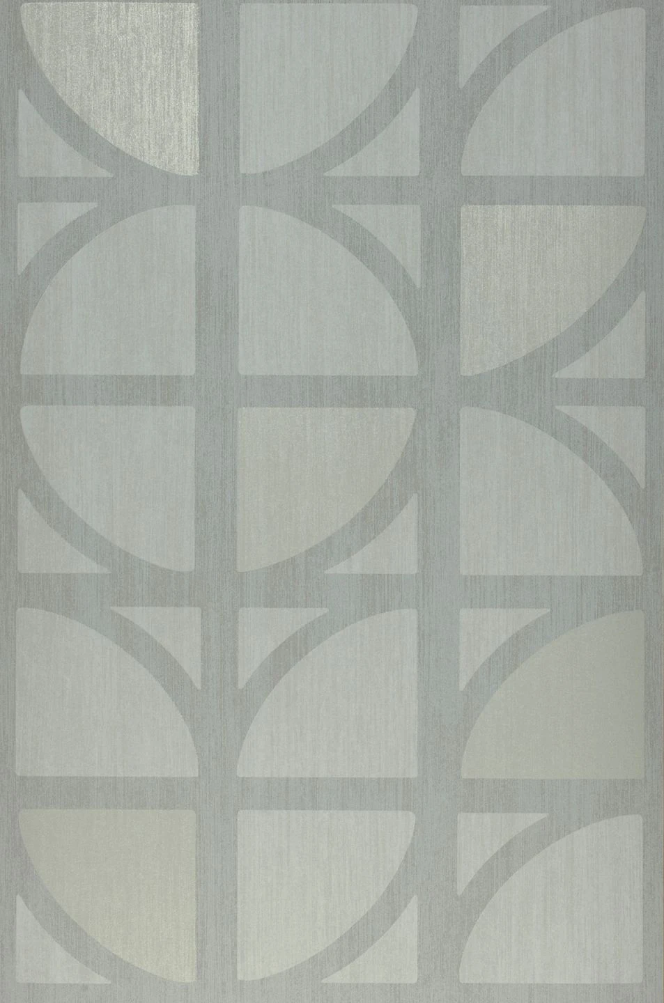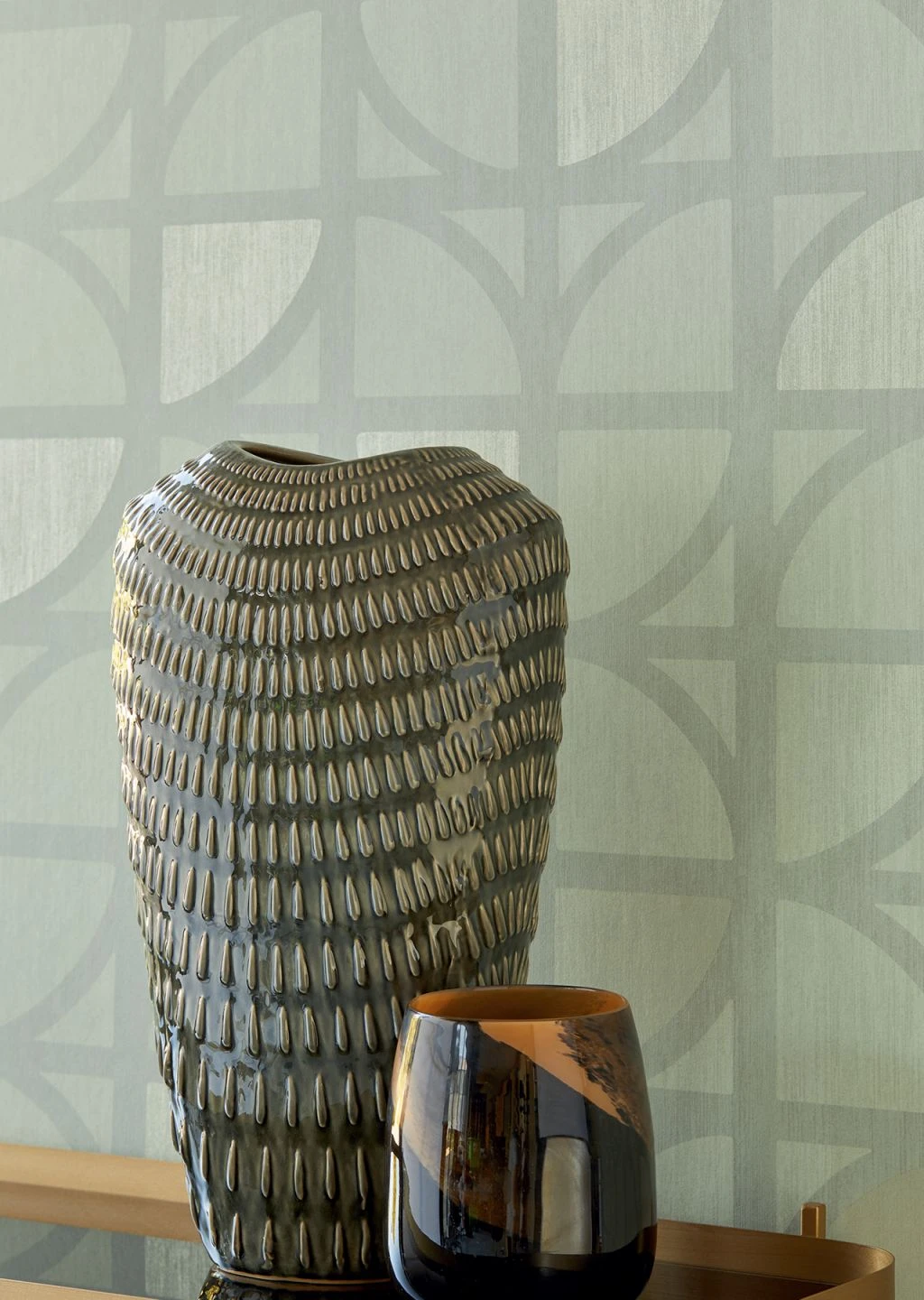 Das moderne geometrische Muster, welches durch seine Unergründbarkeit und Undefinierbarkeit die Blicke auf sich hält, bleibt dennoch in erfrischender Weise durch die Farbgebung in grünlichen Grautönen dezent. Es untermalt besondere Einrichtungen, die von außergewöhnlichen Formen im Design bestimmt werden.