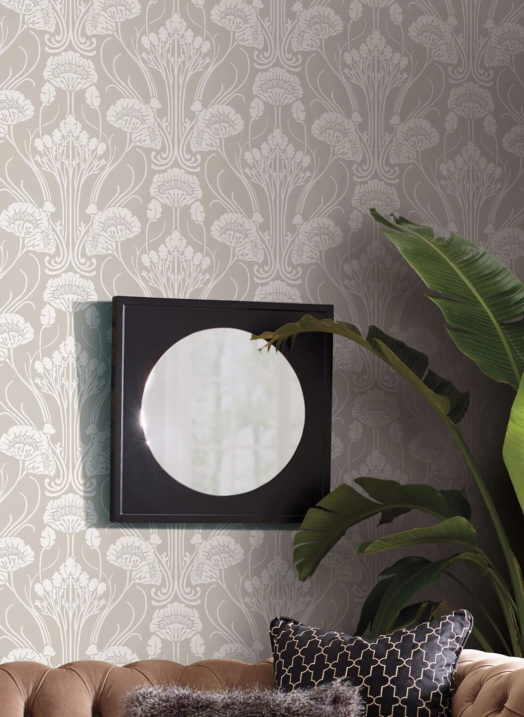 Aus der Struktur des Leimdrucks mehr noch als aus der Dynamik des Farbkontrastes zieht das Muster dieser Vliestapete seine Kraft. Die typischen stilisierten Blütenpflanzen des Jugendstils mit ihren ineinander verschlungenen Blättern und Stängeln sind in Cremeweiß auf zart hellgrauem Grund gehalten. Durch den Farbauftrag im Leimdruckverfahren erhalten sie eine fühlbar erhabene Struktur und entwickeln ihre besondere Wirkung im Wechselspiel von Licht und Schatten.