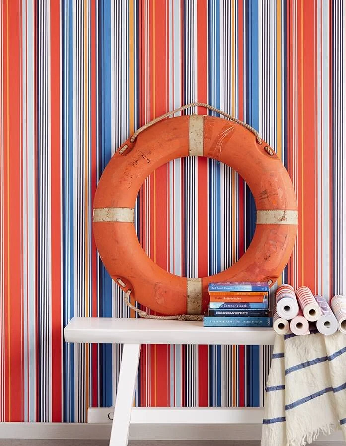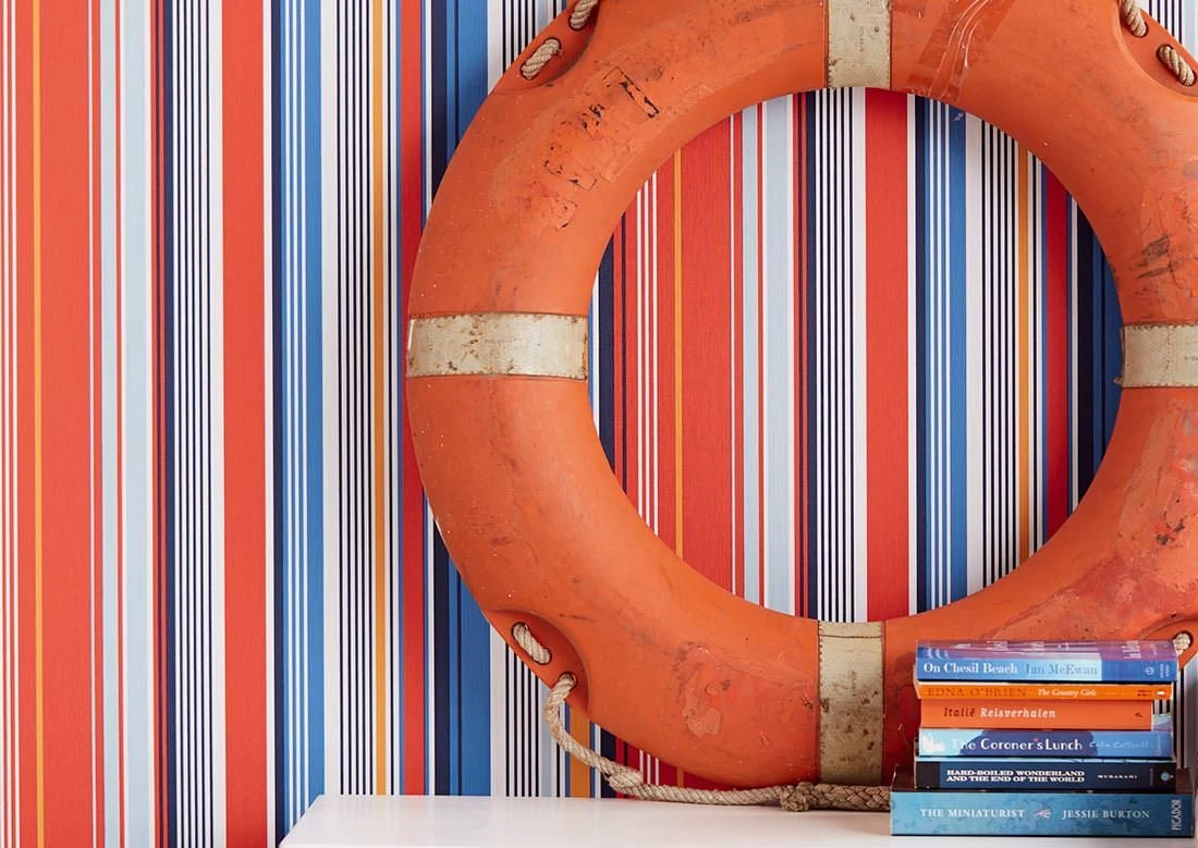 Drücken Sie den Powerknopf mit Streifentapete Sinja in ausdrucksstarken Farben. Feine Linien, breite und schmale Streifen wechseln sich in Blau, Dunkelblau, Orange, Rot, Weiss ab. Die poppige Designtapete mit scheuerbeständiger Vinyloberfläche in feiner Struktur ist bereit für Abenteuer. Wie eine bunte Unterwasserwelt, die es zu erkunden gilt.
