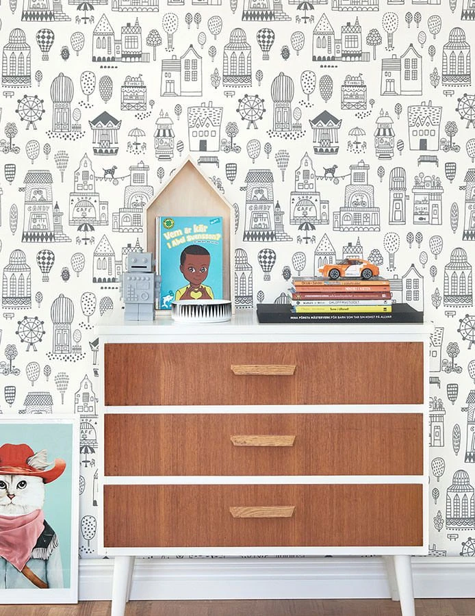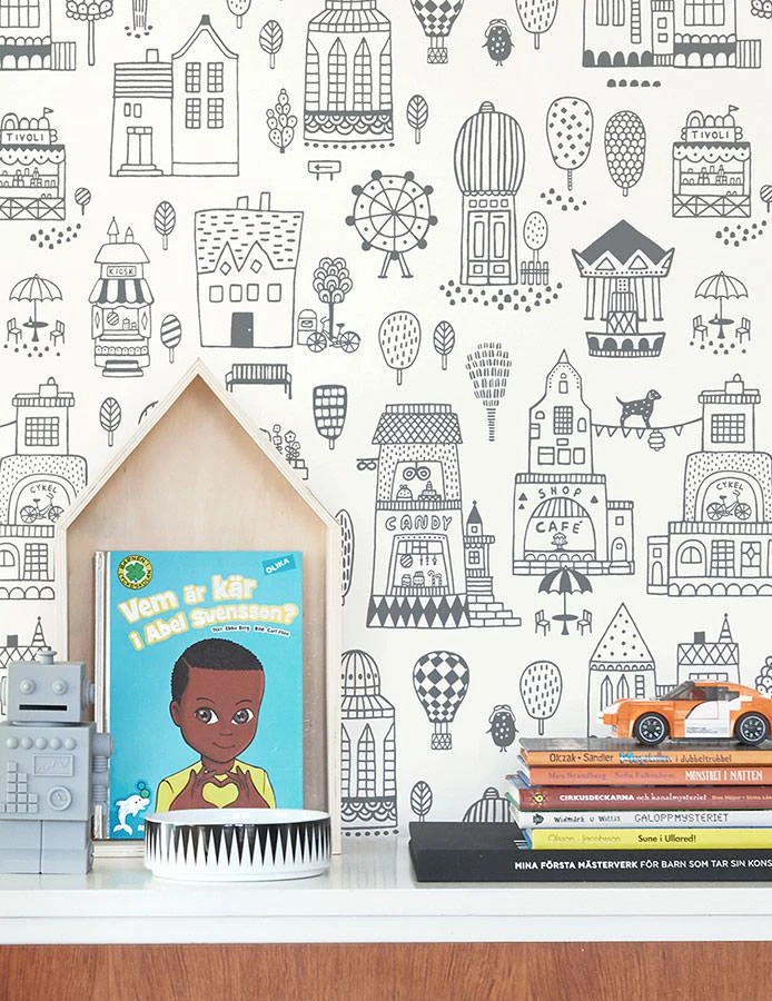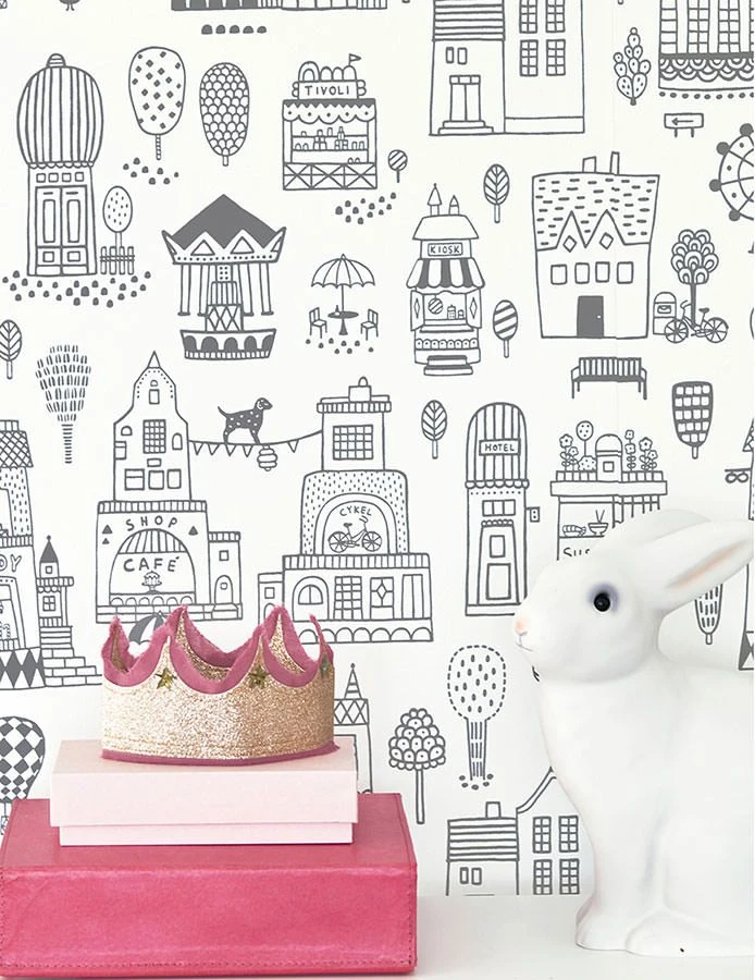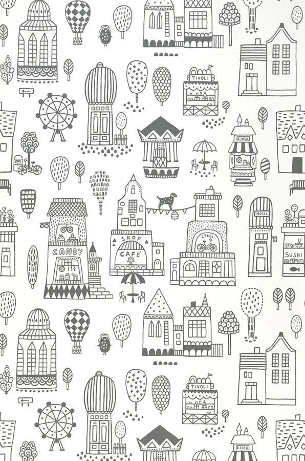 Kinder, heute wird’s was geben – Diese Stadt hat es in sich und ist keine gewöhnliche Stadt. Neben Häusern, Lollipop-Bäumen, romantischen Palast- und Burgbauten, entdeckt das Auge auch einen lebhaften Jahrmarktrummel und balancierende Hunde. Die schwarz-weiße Gestaltung der waschbeständigen Designer Tapete von Majvillan lässt viel Raum für bunte Fantasie.