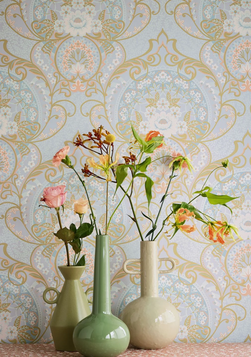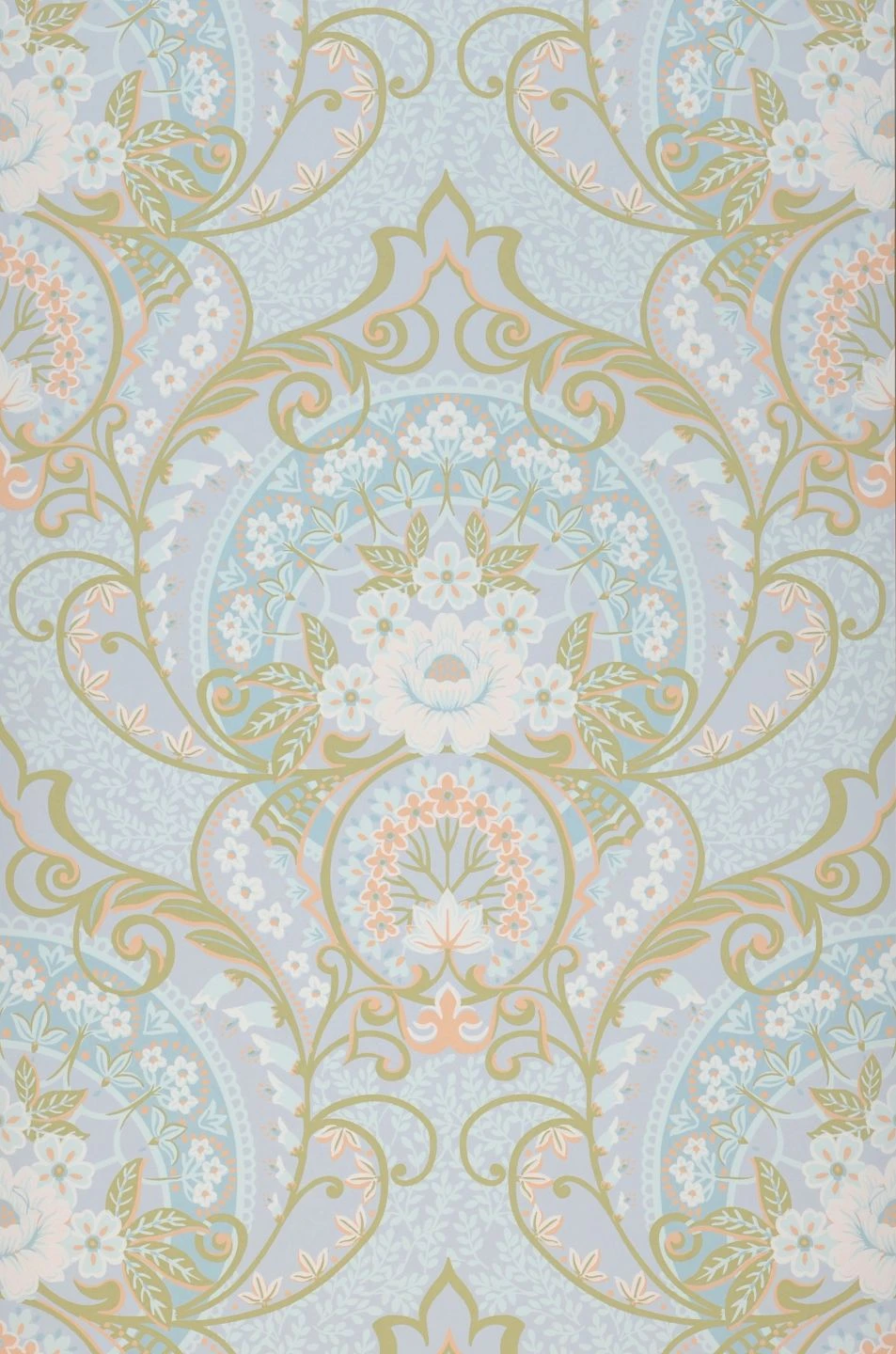 Verschiedene zarte Nuancen von Hellblau bestimmen den Charakter dieser Tapete mit ihrem klassisch anmutenden und gleichzeitig unbekümmerte Leichtigkeit ausstrahlenden Blumenmuster. Hinzu kommen Schilfgrün und Lachsrosa für farbliche Akzente. Die Vielfalt der Blütenformen und der elegant geschwungenen Blattranken und abstrakten Ornamente macht Sofia zu einer Besonderheit unter den klassischen Tapeten.