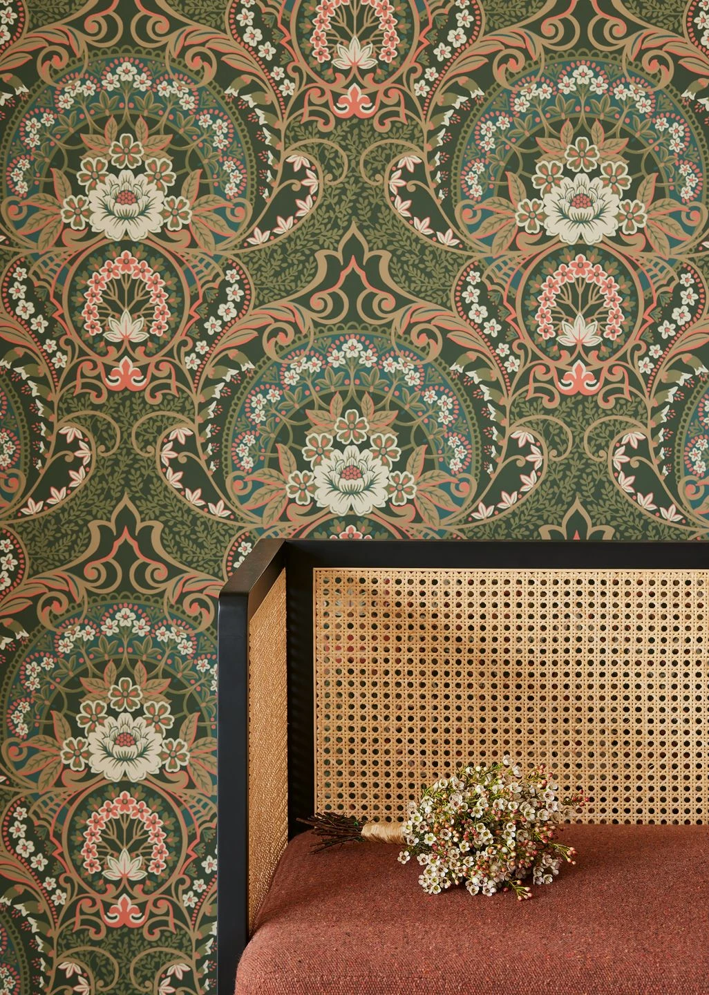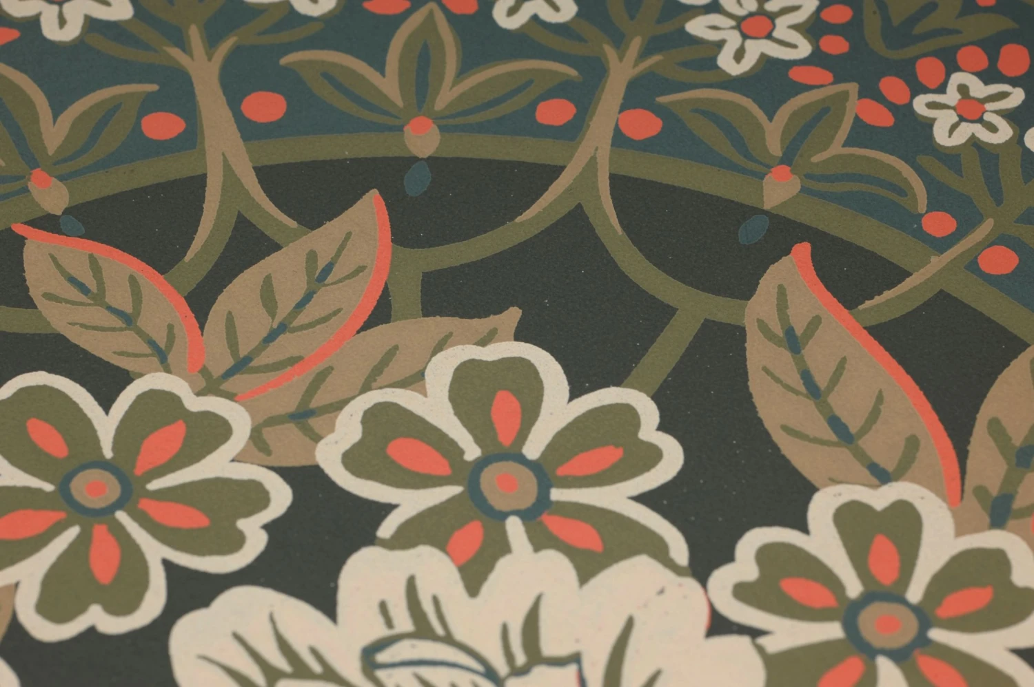 Klassisch und gleichzeitig zeitlos aktuell ist das Blumenmuster angelegt, das Tapete Sofia über und über bedeckt. Im Mittelpunkt stehen große weiße Blüten, umringt von einem beschwingten Reigen kleinerer Blüten und schwungvoll gezeichneter stilisierter Blattranken. Mit dem Tannengrün des Untergrunds harmonieren die nostalgisch anmutenden Grün-, Blau- und Beigetöne wunderbar. Details in Korallenrot setzen wirkungsvolle Akzente.
