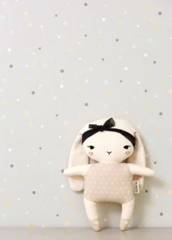 Verträumt und spielerisch wirkt die Kindertapete vom schwedischen Designer Majvillan. Auf dem hellgrauen Untergrund sind im Leimdruckverfahren Punkte in verschiedenen hellen Farben aufgebracht. Sie bilden einen freundlichen, zurückhaltenden Hintergrund für ein Kinderzimmer voller Leben. Wenn Sie eine der verwendeten Farben in der Dekoration aufgreifen, erhalten Sie ein unaufdringliches, fröhliches Gesamtkonzept.