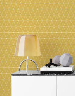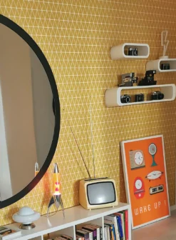 Vintage Charme trifft Skandinavien Look – Frisches warmes Ockergelb als Grundfarbe mit weißen Rauten und Karos sorgt für spritzige Musterfreude, die Retro-Looks mit Space Age Touch ebenso gut bedient wie hochmoderne Einrichtungsideen. Die geometrische Tapete mit glatter, waschbeständiger Oberfläche und leicht zu verarbeitendem Vliesträger zieht die Lebenslust auf ihre Seite.