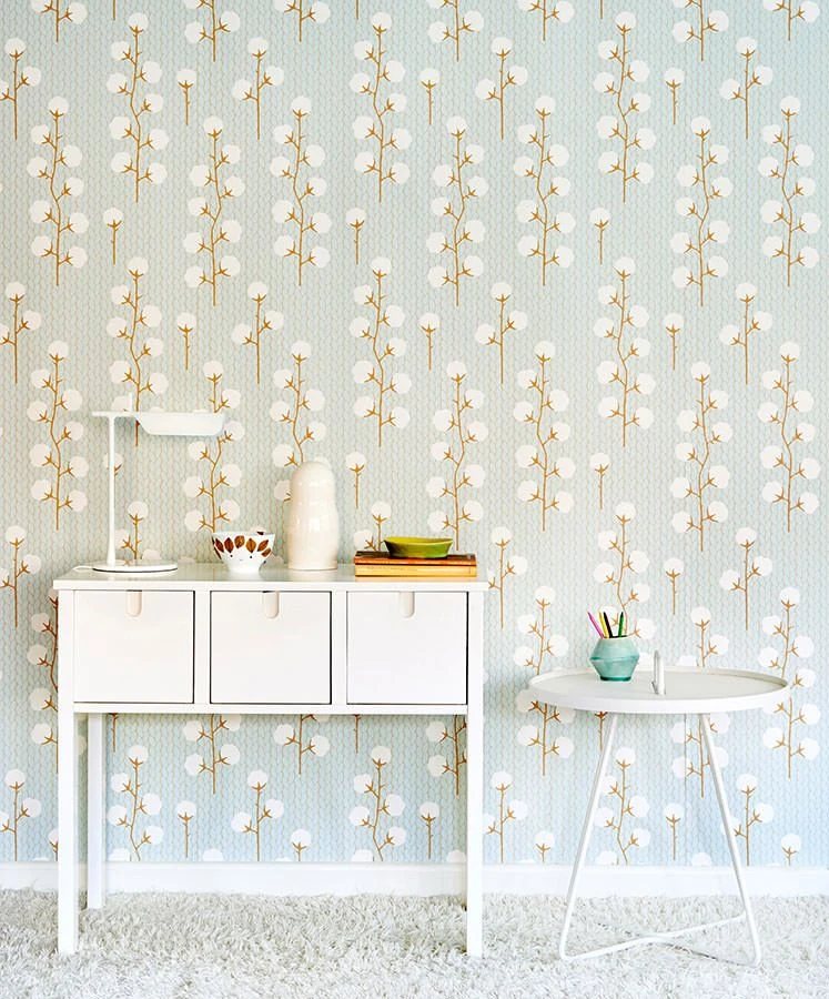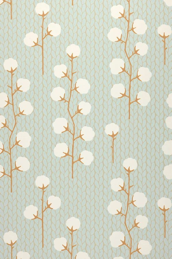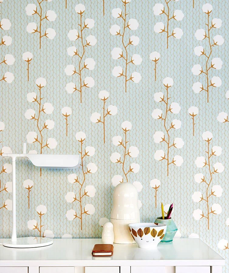 Die im Leimdruckverfahren hergestellte Tapete stammt von dem schwedischen Label Majvillan. Emporstrebende Baumwollpflanzen schmücken den Untergrund, der wie aus geflochtenen Zöpfen wirkt. Hier verbinden sich matte Türkistöne mit Brauntönen und Cremeweiß.