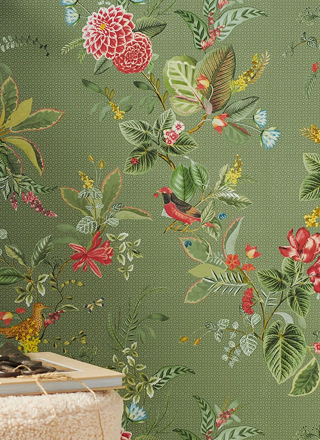 Die schönsten exotischen Blütenpflanzen wirken hier wie locker über die Tapete gestreut. Dazwischen tummeln sich bunte Vögel und Insekten. Das blasse Grün des Hintergrunds, aus dem die Blätter mit ihren hübschen Mustern hervortreten wie aus dem undurchdringlichen Dickicht eines Tropenwalds, bildet eine farblich passende Kulisse. Wer genau hinsieht, entdeckt darauf die fühlbar erhabene Struktur eines Musters, das die Tapete noch zusätzlich belebt.