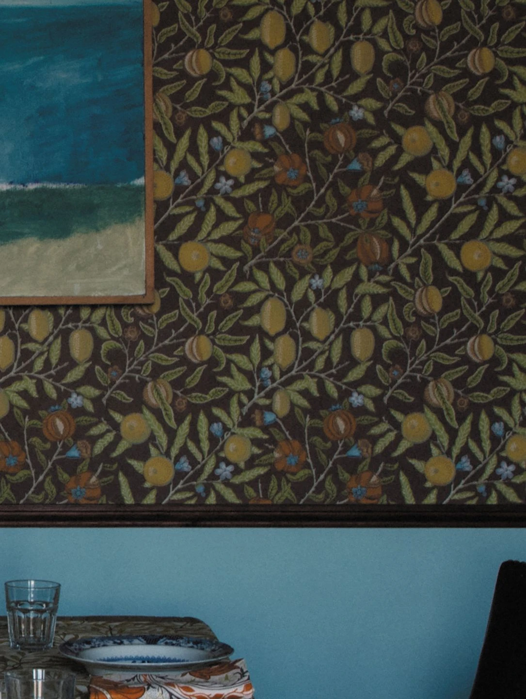 Mit der Papiertapete Therese wirft die renommierte britische Design-Firma Morris & Co. einen Blick aus dem gemäßigten Klima Mitteleuropas in den mediterranen Raum. Fruchtbare Bäume voller Blüten, reifer Zitronen und Granatäpfel machen den Charakter des nostalgischen Designs aus. Auf dem braunen, leicht gemusterten Grund wirken die Früchte besonders verlockend und passen ideal in ein heimeliges Wohnzimmer mit antiken Möbeln.