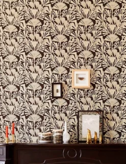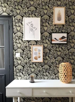Wie ein stilvoller Mix aus Jugendstil und ägyptischer Kunst mutet die florale Mustertapete Tiberia in der Farbzusammenstellung von Schwarz, Cremeweiss und Perlbeige an. Die stilisierten Blüten schimmern sanft, was einen interessanten Kontrast zum matten Untergrund ergibt.