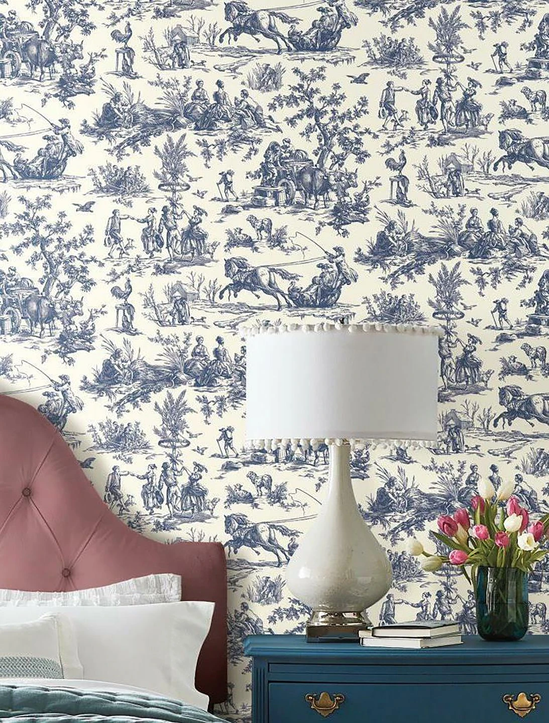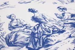 Ganz im Stil der Baumwollstoffe, die im 18. Jahrhundert in Frankreich mit gravierten Kupferplatten bedruckt wurden und besonders filigrane, detailreiche Darstellungen ermöglichten, ist diese kostbare Papiertapete gehalten. Im typischen blauen Farbton auf weißem Grund weist sie Szenen historischen Landlebens auf. Der Stil des Toile de Jouy war von den zarten Malereien auf chinesischem Porzellan inspiriert und macht Ihren Raum zu einer wahren Kostbarkeit.