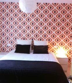 Das ausgeprägte Muster im Stil der 70er Jahre lässt an die geschwungenen, sich gegeneinander drehenden Formen eines vom Wind bewegten Mobiles denken. Die sanften, abgerundeten Rauten und Wellenlinien in Orange, Braun und Hellelfenbein, die als Relief in der Vinyloberfläche fühlbar sind, passen perfekt zu Möbeln im Retro-Stil. Die waschbeständige Tapete lässt sich sogar in Ihrem Bad stilvoll einsetzen.