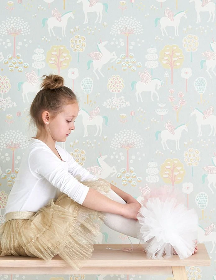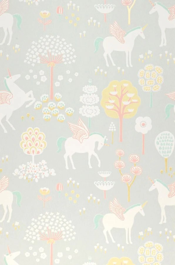 Musterelemente in Altrosa, Cremeweiss, Hellgelb, Pastellgrün und Ocker Schimmer auf feinem Hellgrau ermöglichen Entspannung, Einhorn-Fantasy mit Happy End und beflügelnde Inspiration. Die waschbeständige Kindertapete von Majvillan ist ein herrlicher Wandstoff aus dem Mädchenträume gemacht werden.