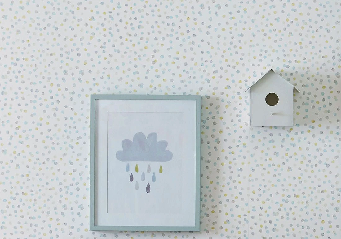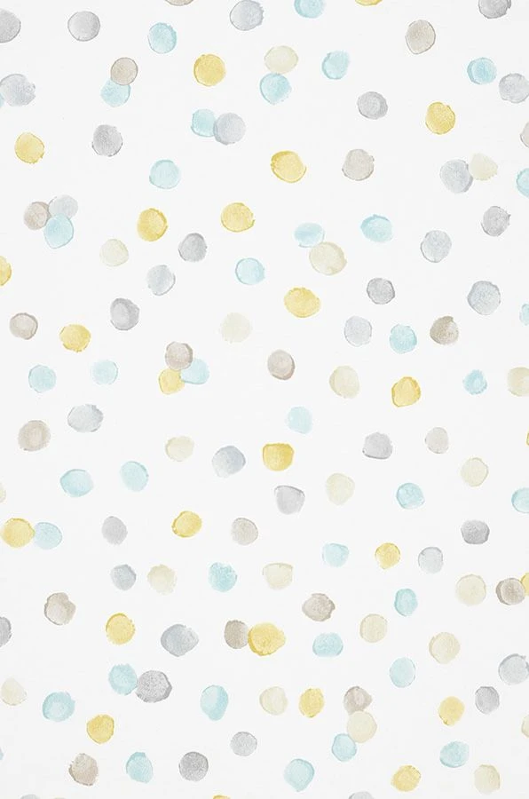 Wie mit einem Pinsel von Hand auf die Wand getupft wirken die unregelmäßig angeordneten Punkte in zartem Zitronengelb, Minttürkis und Beigetönen auf dem cremeweißen Grund der Papiertapete. Sie bringen frühlingshafte Leichtigkeit und Frische mit und schaffen eine sonnige Atmosphäre im Kinderzimmer. Mit weißen oder kiefernfarbenen Möbeln oder in Kombination mit einer der Musterfarben entsteht ein freundlicher, anregender Raum.