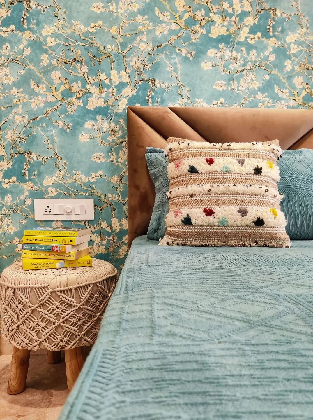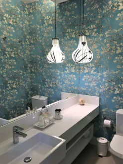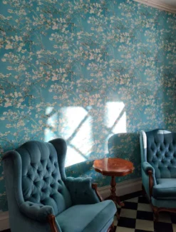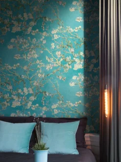 Inspiriert von den Gemälden Vincent van Goghs, zeigt die Vliestapete Mandelzweige voller zarter Blüten auf strahlend türkisfarbenem Grund, so als würde man durch die Zweige hindurch den wolkenlosen Sommerhimmel sehen. Die kräftigen Pinselstriche van Goghs sind in der Vinyloberfläche fühlbar. Gleichzeitig sorgt das hoch waschbeständige Oberflächenmaterial dafür, dass Sie die Tapete selbst in einem Badezimmer einsetzen können.