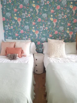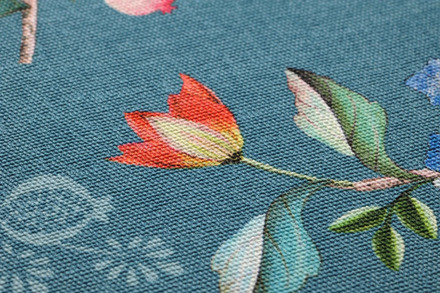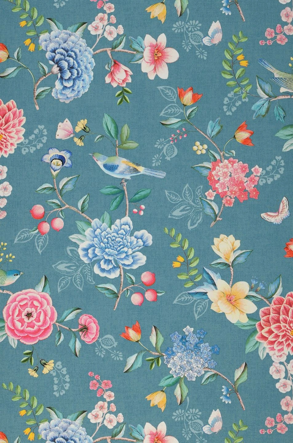 Leuchtende Farben mit fließenden Übergängen, die einen fast plastischen Eindruck erzielen, schmücken die Blumen, Vögel und Schmetterlinge auf dieser Tapete. Der türkisblaue Hintergrund hat die Farbe des Sommerhimmels. Das Oberflächenmaterial aus Vinyl sorgt für intensive Farben und hat eine leichte fühlbare Struktur wie ein gewebter Stoff. Es ist waschbeständig und auch für das Bad geeignet.