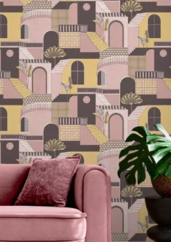 Märchenhaft orientalisches Flair zieht mit der Art-Deco-Papiertapete Verney bei Ihnen ein. Aus geometrischen Formen setzt sich eine Stadt zusammen, komplett mit Häusern und Torbögen, Treppen, Fenstern und Balkonen. Die Rosa- und Sandgelbtöne in Verbindung mit Schwarz und Weiß bilden eine Vielfalt von Kachelmustern, die die einzelnen Häuser voneinander unterscheiden. Wenn Sie die Themenwelt Orient in Ihrer Einrichtung aufgreifen, schaffen Sie ein stimmiges und stimmungsvolles Ambiente.