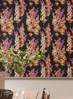 Die schwarze Grundfarbe dieser außergewöhnlichen floralen Tapete lenkt die ganze Aufmerksamkeit auf die leuchtenden Farben der Stockrosen, aus denen sich das elegante Muster zusammensetzt. Die kräftigen Rosa-, Violett-, Gelb- und Beigetöne scheinen auf dem dunklen Grund eine ganz eigene Leuchtkraft zu entwickeln. Besonders kostbar wirkt die Tapete durch das verwendete Leimdruckverfahren, das den Farbauftrag wie handgefertigt erscheinen lässt.