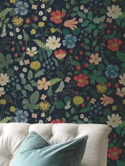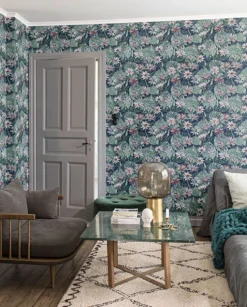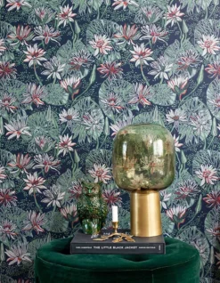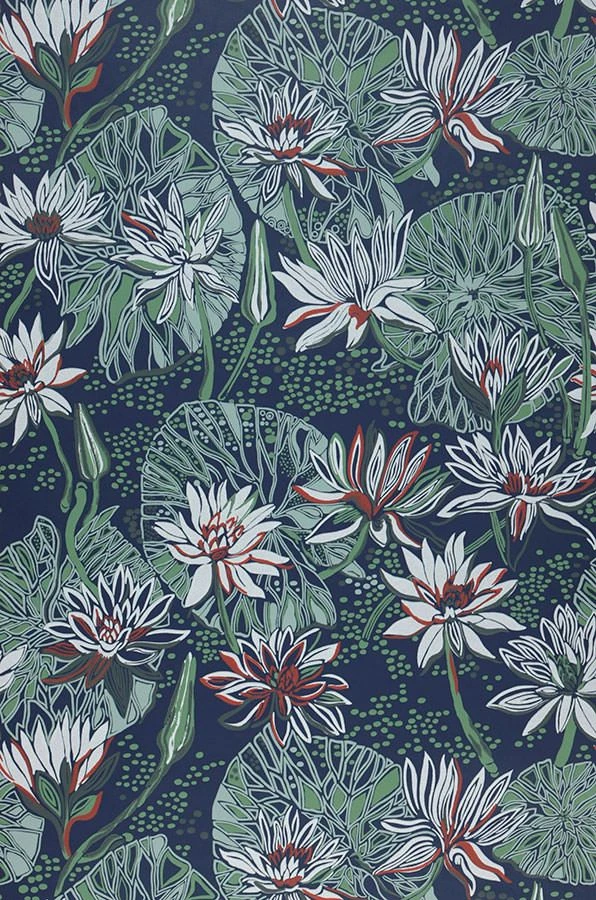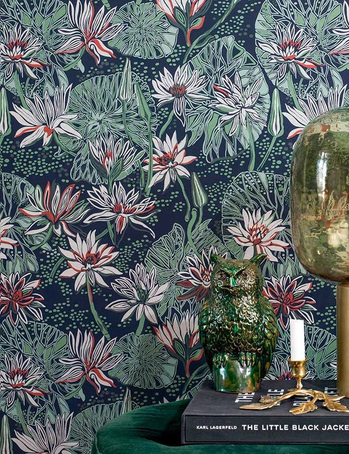 Blumig vintage und von koketter Schönheit – Das ist Yvette, eine Blumentapete mit starkem Understatement für kunstvolle Wandgestaltung. Saphirblau in Verbindung mit den Musterfarben Grauweiss, Pastellgrün, Pastelltürkis, Rot verleiht der Vliestapete mit wunderbaren Seerosen eine Tiefenwirkung, die im Raum starke Präsenz zeigt.