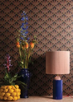 Ornamente aus stilisierten Blättern, mit wenigen kupferbraunen und hellgrauen Linien schraffiert auf dem schwarzbraunen Grund, bilden das wirkungsvolle Design im Stil des Art Deco. Die dunklen Farbtöne schmücken Ihren Raum und lassen ihn ruhig und hochwertig wirken. Gelbe Punkte verzieren das Muster der Vliestapete mit hellen Highlights. Charaktervolle Retro-Möbel in dunklen oder rötlichen Holztönen sind eine perfekte Ergänzung.