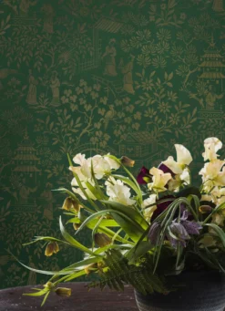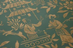 In schlichten, flächigen Formen, wie mit einem Stempel auf den patinagrünen Grund aufgebracht, schaffen stilisierte Szenen einer Parklandschaft voller Tempel, Brücken und Kraniche, dazwischen einige menschliche Figuren, ein fernöstliches Ambiente. Die Kombination des golden schimmernden Musters und des dunklen Grün machen Vliestapete Zen Garden zu einer zeitlos kostbar wirkenden Kulisse für Ihre Einrichtung im orientalischen Stil.